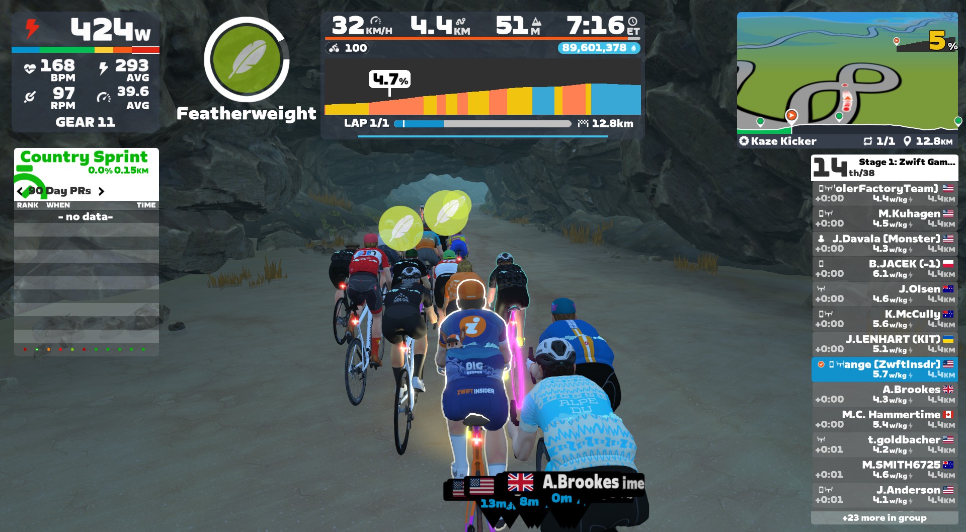 (Zwift’s HUD doesn’t do a great job of showing gaps to riders up the road, since you don’t see them in the rider list if you’re sitting in a group of any size. But I was running Sauce for Zwift, so I could see the gap. Gotta love that rider groups feature!)