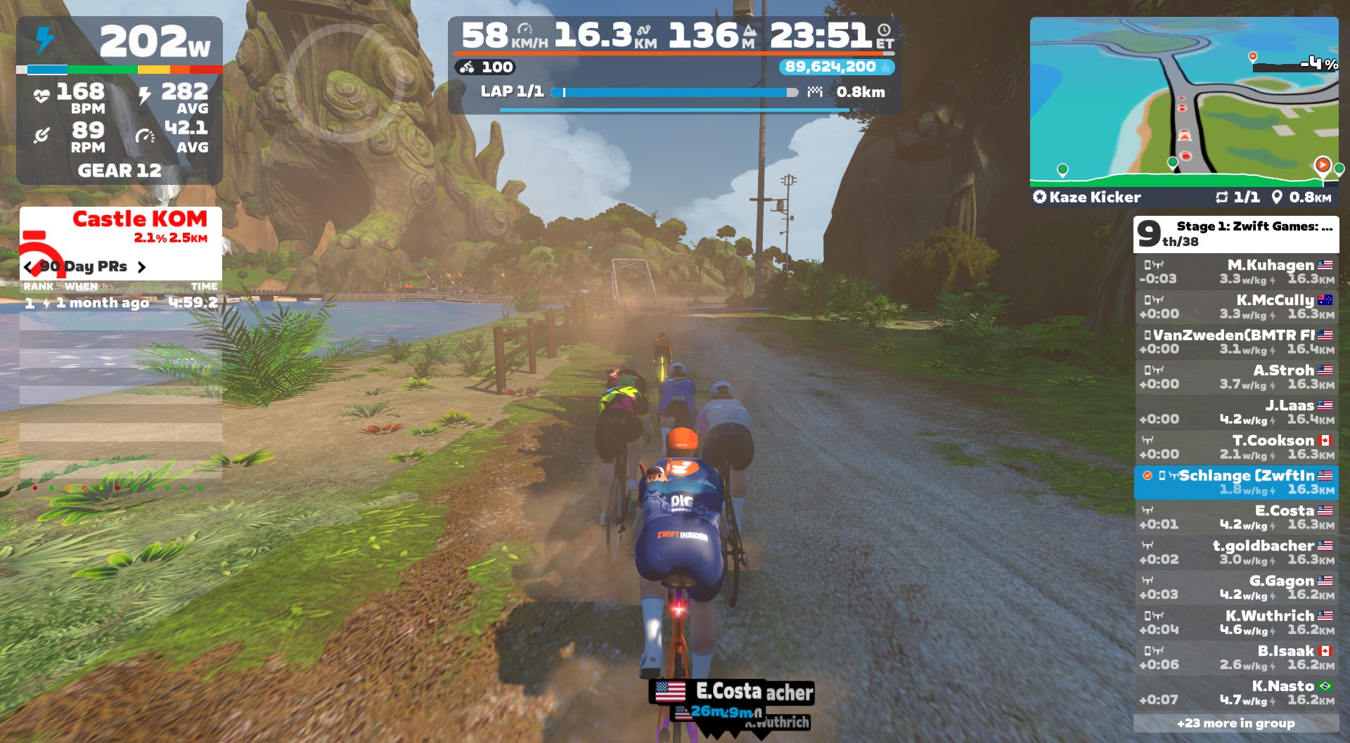 As we exited Pain Cavern, I just tried to sit efficiently in the draft to grab a bit of recovery time. My heart rate dropped from 172 to 154 over the next 5 minutes, and the burning in my legs went away as I spun a higher cadence at tempo power. Around the northern part of Neokyo we went, the two riders off the front staying away but not increasing their gap in a meaningful way.